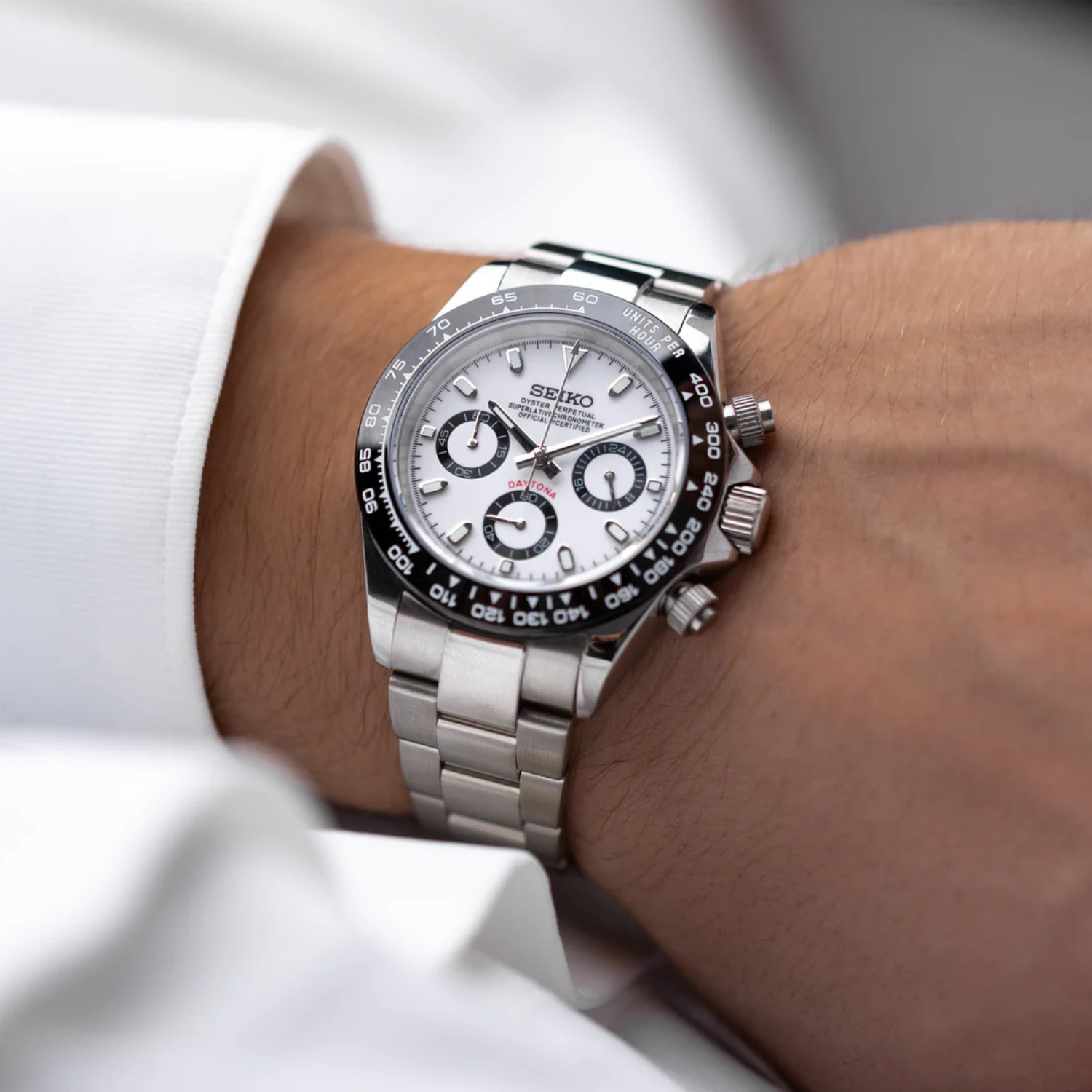 The White Panda Chronograph blends timeless motorsport heritage with modern Seiko precision. Its bold black-on-white dial delivers contrast and clarity, while premium materials ensure every detail feels elevated. Built to perform. Designed to stand out.