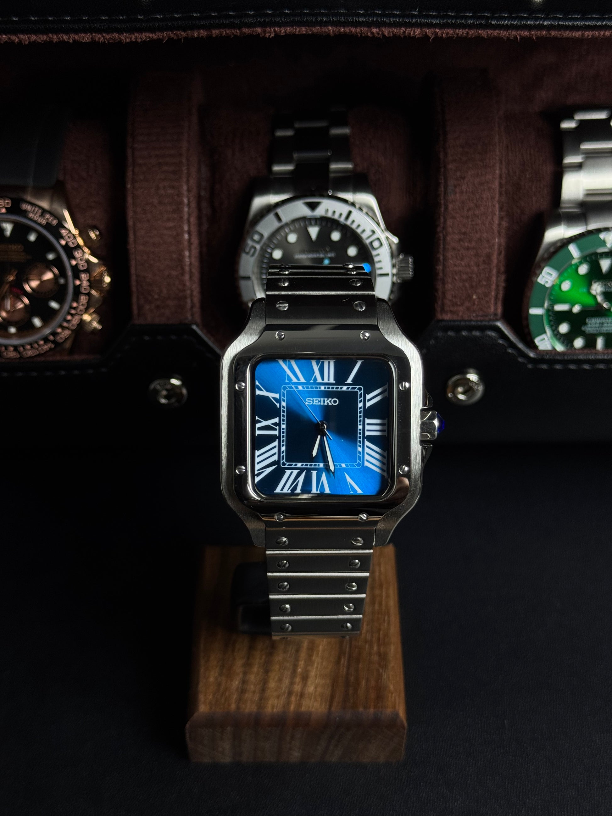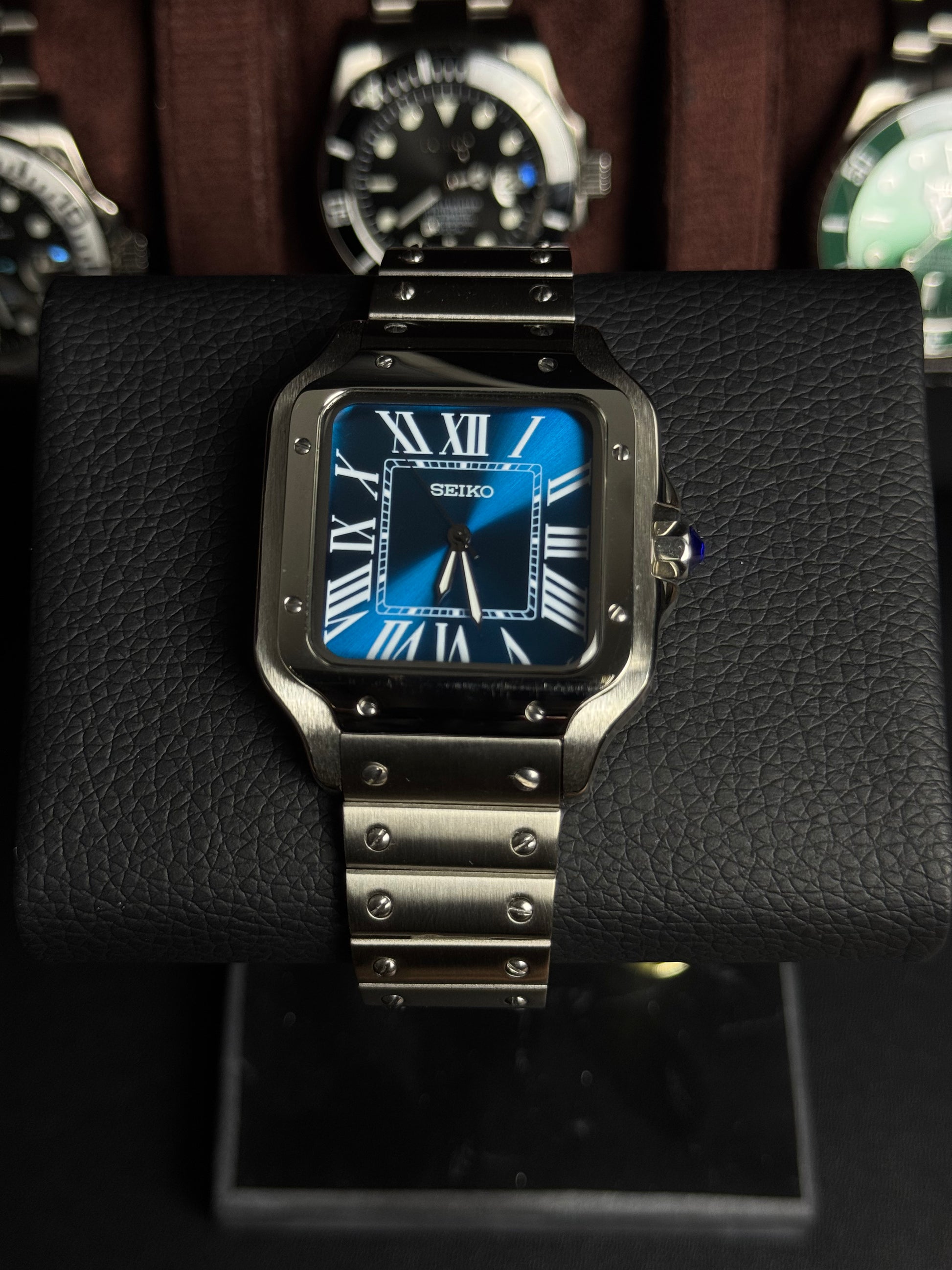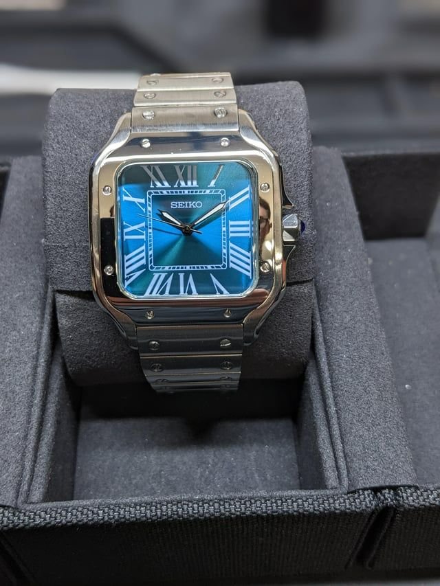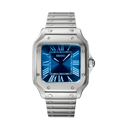 Drawing inspiration from the iconic Santos design, this 38mm watch (which presents as 41mm) incorporates the esteemed Seiko NH35 automatic movement, seamlessly blending luxury with affordability.